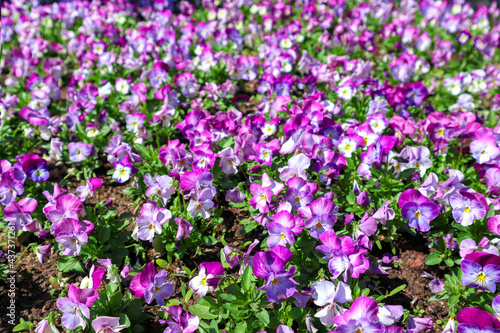 Pansies flowers. Bright spring floral pattern with natural lit by sunlight. Beautiful fresh nature background.