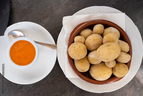 Papas arrugadas in clay plate and spicy mojo sauce on side from top. Traditional wrinkled potatoes snack food from Gran Canaria island, Spain