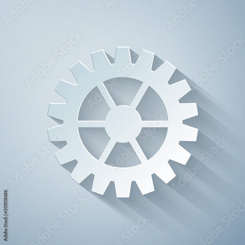 Paper cut Gear icon isolated on grey background. Cogwheel gear settings sign. Cog symbol. Paper art style. Vector Illustration
