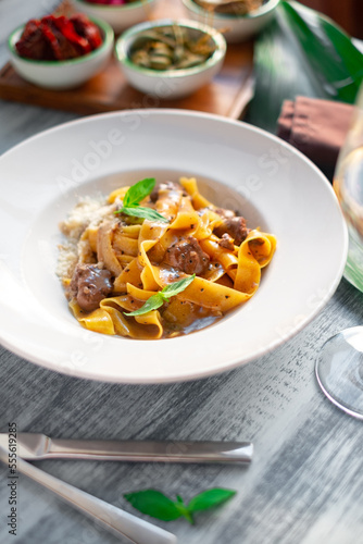 Pappardelle pasta with beef, gravy, parmesan and basil on a white plate. Italian dish served on a table, close up