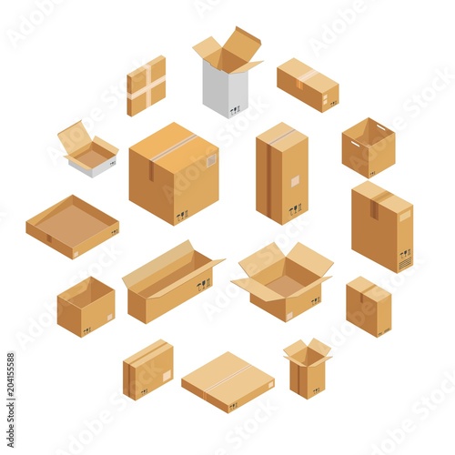 Parcel packaging box icons set. Isometric illustration of 16 parcel packaging box vector icons for web