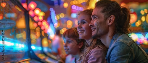 Parents and kids at an amusement park, bright indoor lighting, medium shot, thrilled faces, arcade games, casual outfits, fun-filled environment, colorful and lively, excitement