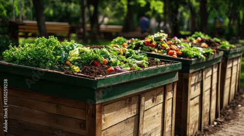 Park compost bins overflowing with vegetable scraps, soil, and sunlight