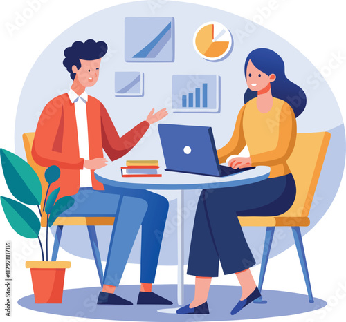 Partners meeting for business discussion with documents and laptop on desk. Couple at round table, speaking, discussing work, partnership. Flat vector on a white background