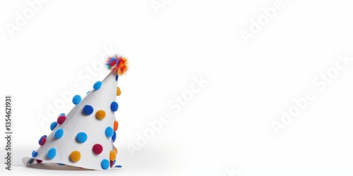 Party Hat White cone with colorful pom-poms on a plain white surface