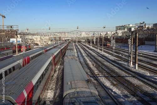 Passenger railway carriages on the railway tracks in the winter season. Crossing railroad tracks.