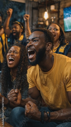 Passionate sports fans in yellow and blue cheering intensely, celebrating a thrilling victory with raised fists and open-mouthed expressions of pure joy and excitement