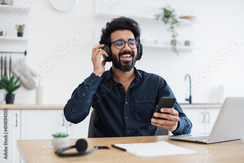 Passionate young man wearing dark shirt and glasses enjoying loud music in headphones while relaxing in dining room. Happy arabian adult using cell phone application for tracks download indoors.