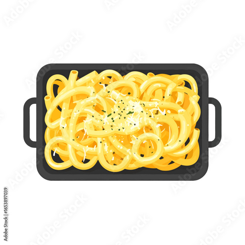 Pasta Dish Featuring Yellow Noodles Parsley Garnish and Cheese on Black Tray Above Top View