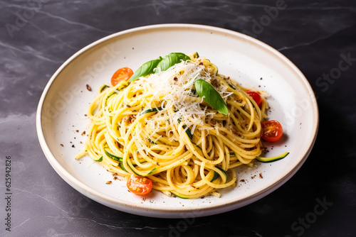 Pasta with greens and parmesan cheese on marble table, homemade easy meal recipe for lunch or dinner, generative ai
