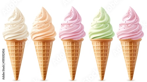 Pastel Colored Ice Cream Cones on White Background with Flat Design