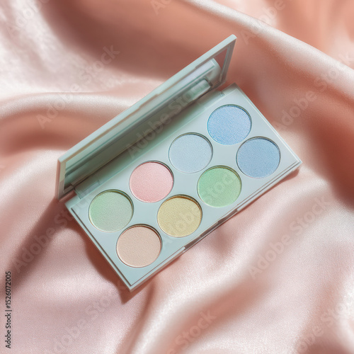 Pastel eyeshadow palette featuring soft shades of mint green, baby blue, pink, and yellow, elegantly displayed on silky pink fabric. colors evoke fresh and playful vibe