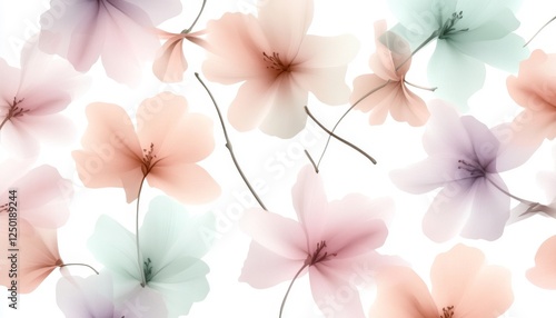 Pastel floral design, delicate blossoms floating, white background, website banner, spring decor