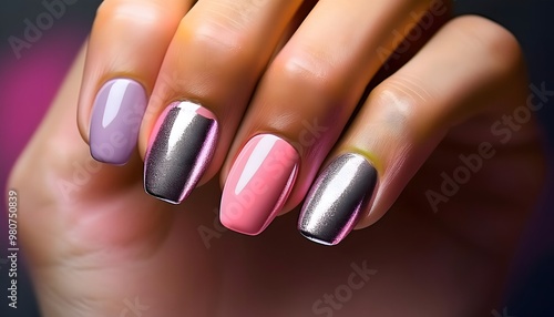 Pastel gradient nails from light pink to lavender. Complete with delicate silver foil.