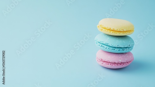 Pastel macarons stacked, light blue background, food photography, recipe blog