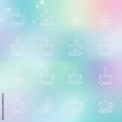 Pastel minimalist tea cup icons collection with herbal leaves and steaming effects in gradient backgrounds