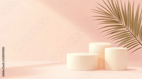 Pastel podiums, sunlit, palm leaf, display background, aesthetic product presentation