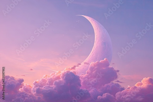 Pastel-toned celestial scene with a crescent moon nestled among soft pink clouds
