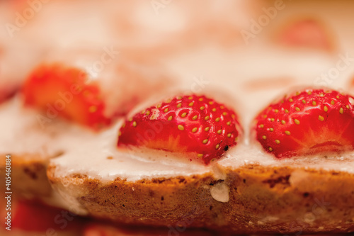 Pastries with red berries and white cream. Cake with strawberries and sour cream. Close-up. Food. Copy space. Selective focus.