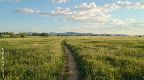 Path through verdant grassland leading to distant mountains under soft sky