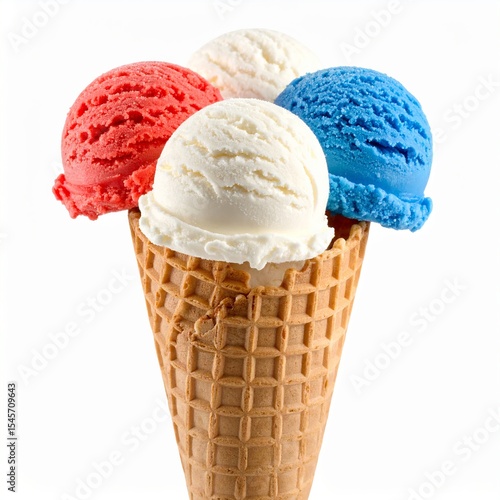 Patriotically colored ice cream scoops in a waffle cone
