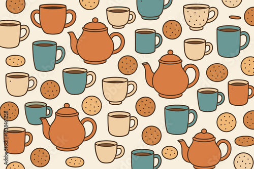 Pattern of teapots, cups, and cookies on a light background with various shapes and colors