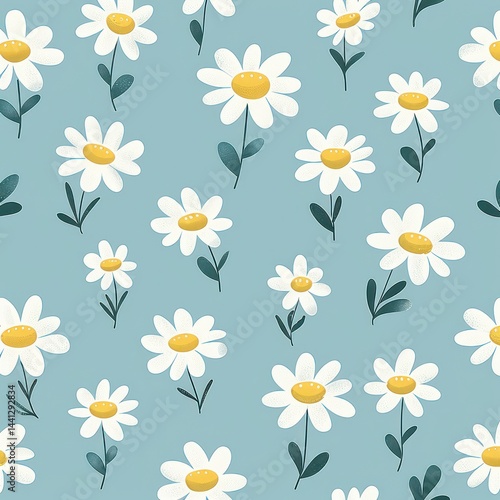 Pattern of white daisies with yellow centers and green leaves scattered on a light blue background, evoking a fresh and cheerful springtime mood