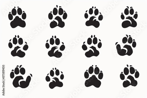 Paw footprint icon, animal foot print, dog step, wolf trail, bear trace silhouette, paw footprint on white