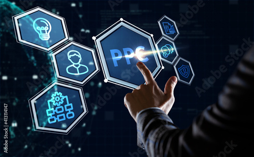Pay per click payment technology digital marketing internet concept of virtual screen. PPC