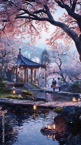 peaceful garden gathering, elderly atomic bomb survivors meet in a peaceful japanese garden during cherry blossom season, holding lanterns as symbols of peace and their fight against nuclear weapons