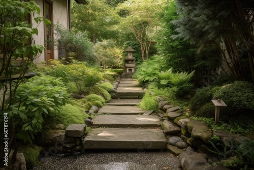 peaceful garden with running water and sound of trickling water, created with generative ai