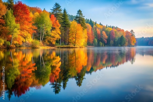 Peaceful lakeside scene with fall foliage reflected in calm waters