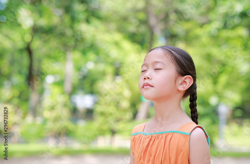 Peaceful little Asian child girl close their eyes in garden with Breathe fresh air from nature. Portrait of kid relax in green park for good health.