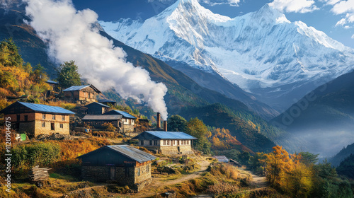 peaceful mountain village surrounded by majestic peaks and autumn colors