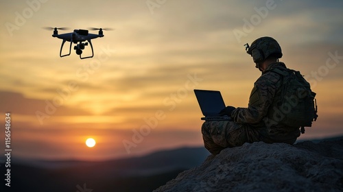 Peaceful Soldier with Laptop and Drone in Camouflage Silhouette of are