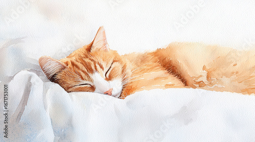 Peaceful watercolor portrait of sleeping orange cat on soft white blanket, radiating warmth and tranquility