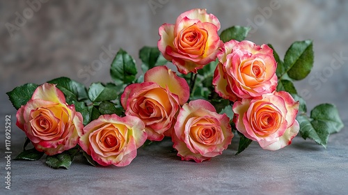 Peach & pink roses bouquet on grey surface, textured backdrop.