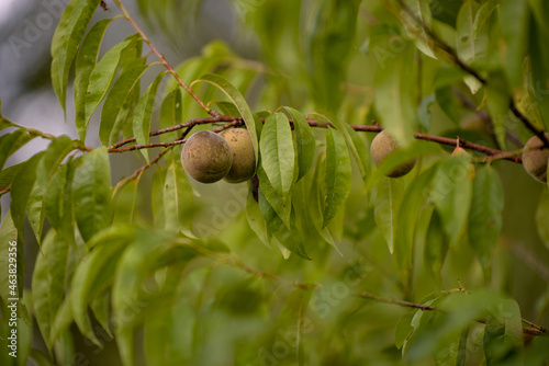peach cultivation in the orchard. Prunus persica unripe fruits in the tree. rich culture in the summer