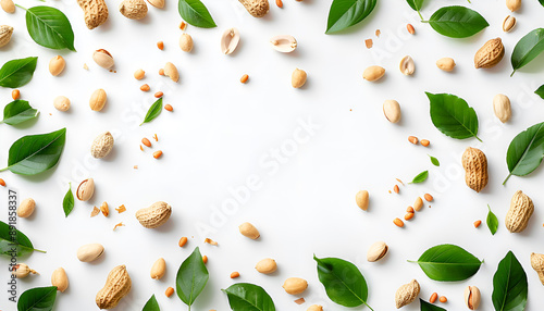 Peanuts with shells decorated with green leaves isolated on white background with copy space for your text, top view. Flat lay pattern.