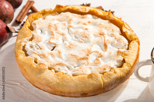 Pear delicious pie and coffee, homemade pastry with cinnamon, sweet dessert for breakfast. Copy space.