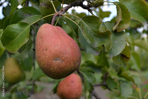 Pear. Pyrus communis. Tree with ripe pear fruit. The branches of a pear tree. close-up. Green leaves
