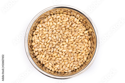 Pearl Barley from above in a stainless steel bowl, isolated on a white background. Healthy ingredient used in soups and casseroles. Naturally preserved grain with long shelf life.