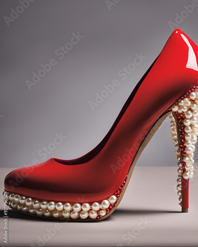 pearls, red high heels, high heel shoes, elegant shoes, pearl accents, luxury footwear, red stilettos, high heel fashion, pearl embellishments, glamorous shoes, red pumps, fashionable heels, pearl det