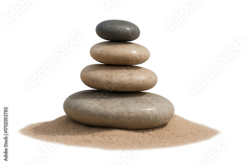 Pebble stack balancing delicately on sandy surface, creating zen-like minimalist composition