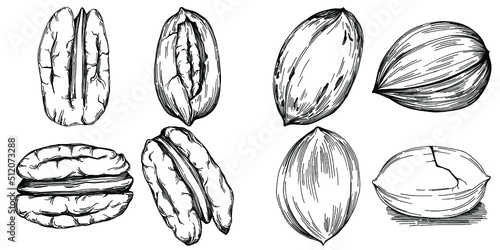 Pecan hand-drawn Vector Illustration isolated on white background. Retro style farm product for restaurant menu, market label, logo, emblem and kitchen design. Decoration for food packaging.