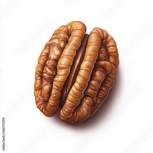 Pecan nut displayed on a clean white background, highlighting its unique texture and natural contours in a well-lit setting