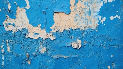Peeling blue paint on weathered exterior wall