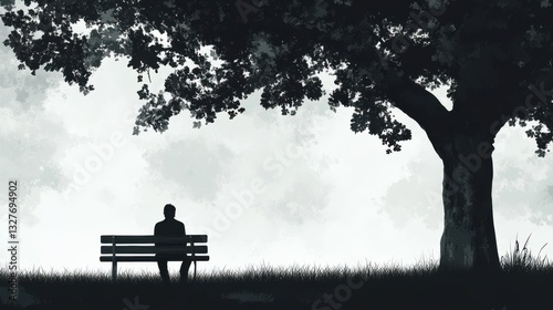 Pensive silhouette of a person sitting on a bench under a tree, contemplative mood, copyright-free