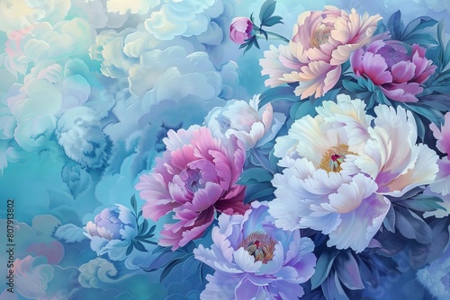 peony in the ancient art of China, Retro, nostalgic, golden brushstrokes. Textured background. modern Art. Floral leaves, green, gray, wallpaper, poster, card