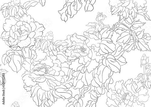 Peony tree branch with flowers in the style of Chinese painting on silk Seamless pattern, background. Outline hand drawing vector illustration..